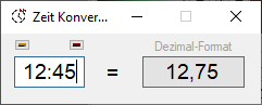 Dies ist ein kleiner Zeit Konverter. Ich stand oft vor dem lästigen Problem, zwischen der klassischen Uhrzeit (12:45) und der Dezimalzeit (12,75) hin und her umrechnen zu müssen. Ist zwar kein Ding in Excel, aber deshalb immer Excel "anschmeißen"... das will ich nicht.